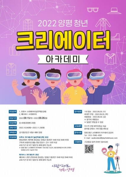 양평 청년 크리에이터 아카데미 기초과정 수료생, 청년참여형 미디어 콘텐츠 맞춤형 교육 수료생을 선발 우대하며 현재 유튜브 크리에이터로 활동하는 청년을 대상으로 선발할 예정이다.