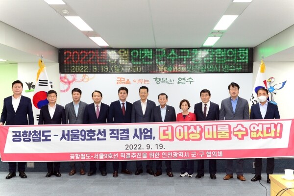 ‘공항철도-서울9호선 직결 추진을 위한 인천광역시 군·구 협의체’는 상임위원장 중구청장, 공동위원장 계양구청장, 서구청장을 주축으로 인천시 자치단체장이 모두 참여해 구성했다.