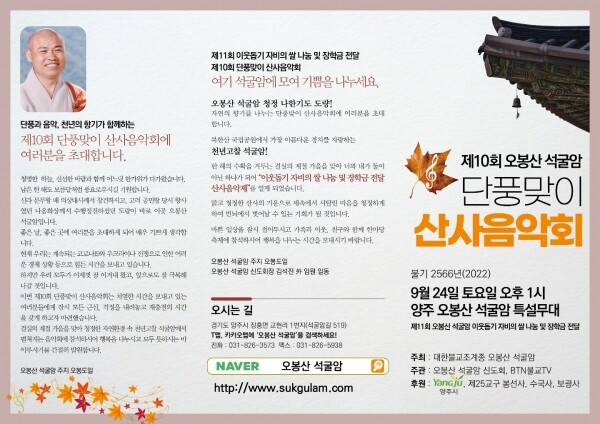 오봉도일 스님은 “북한산 국립공원에서 가장 아름다운 경치를 자랑하는 천년고찰 석굴암에서 결실의 계절 가을을 맞아 산사음악제를 열게 됐다”며 “바쁜 일상은 잠시 접어두시고 가족과 이웃, 친구와 함께 한마당 축제에 참석해 행복을 나누는 시간을 보내길 바란다”고 말했다.