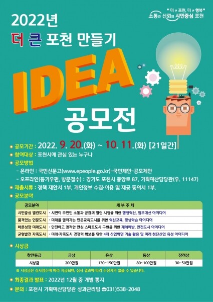 접수는 국민 참여 포털 국민 신문고 공모 제안을 통해 응모할 수 있으며 포천시 기획예산담당관으로 우편 접수 또는 방문 접수도 가능하다.