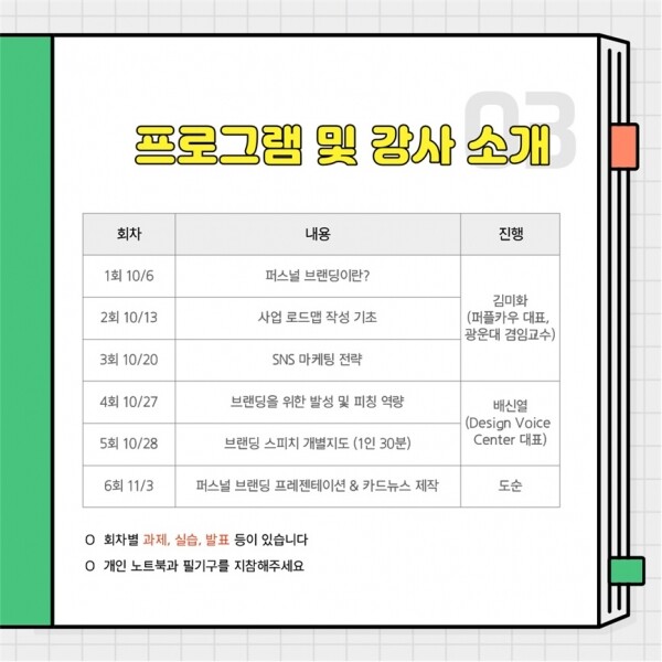 ‘브랜딩 첫걸음’은 ▼퍼스널 브랜딩이란? ▼사업 로드맵 작성 기초 ▼SNS 마케팅 전략 ▼브랜딩을 위한 발성 및 피칭 역량 ▼브랜딩 스피치 개별지도 ▼퍼스널 브랜딩 프레젠테이션&카드뉴스 제작 등 총 6회 과정으로 진행되며 회차별로 과제, 실습 및 발표가 있을 예정이다.
