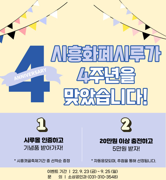 시 관계자는 “시루를 사랑해주는 시민들에게 감사의 마음을 전하기 위해 준비한 시루 4주년 이벤트에 많은 참여를 바란다”며 “지역경제 활성화를 위해 앞으로도 시흥화폐 시루가 앞장서겠다”고 밝혔다.