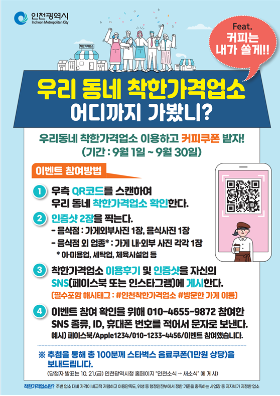 인천광역시은 착한가격업소 이용 후기를 사회관계망서비스에 올리면, 추첨을 통해 커피쿠폰을 지급하는 이벤트를 오는 30일까지 실시한다고 밝혔다.