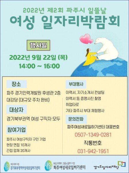 이번 ‘일뜰날’ 박람회는 경기북부권역 여성 구직자와 파주시 여성구직자 구인업체 30여 개사가 만나 현장면접 등 대면 행사로 진행될 예정이다.