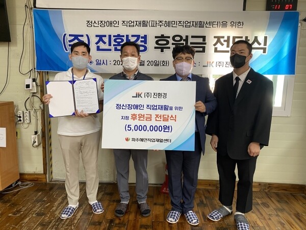 강석식 ㈜진환경 대표이사는 “사회적 편견과 낙인으로 인해 지역사회로부터 고립돼 살아가는 정신장애인의 삶에 조금이나마 도움을 주고자 마음을 모아 전달하게 됐다”고 소감을 전했다.