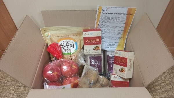 ‘2022년 파주 농산물 상생 나눔 꾸러미 지원’ 사업을 통해 준비된 농산물 꾸러미는 한수위 쌀 등 파주 지역에서 생산된 농산물과 가공품으로 구성돼 있다.