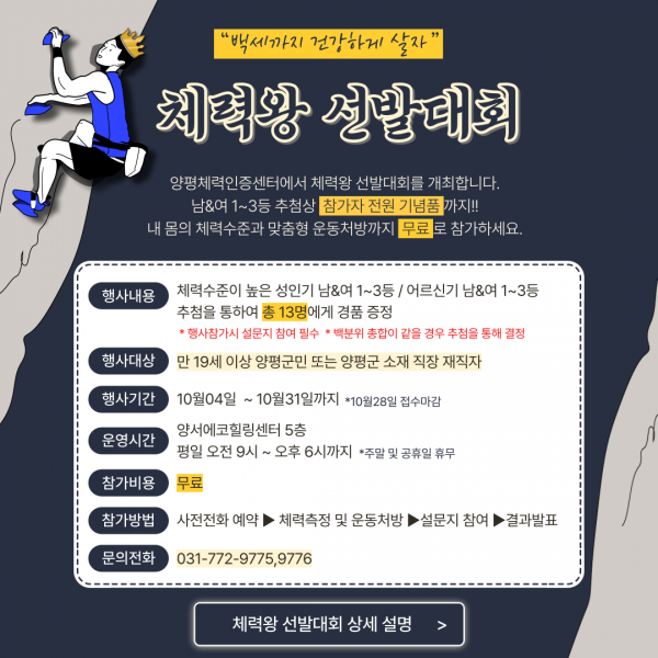 체력왕 선발대회는 양평체력인증센터가 개최하는 가장 큰 행사로 만 19세 이상 양평군민 또는 양평군 소재 직장 재직자를 대상으로 진행되며 각 기준에 맞는 체력측정을 통해 체력측정 항목의 백분위 총합이 가장 높은 사람을 선발한다.