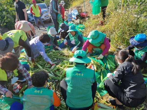 이날 이른 아침부터 모인 협의체 위원들과 새마을협의회 회원들은 함께 구슬땀을 흘리며 정성스럽게 옥수수를 수확했다.