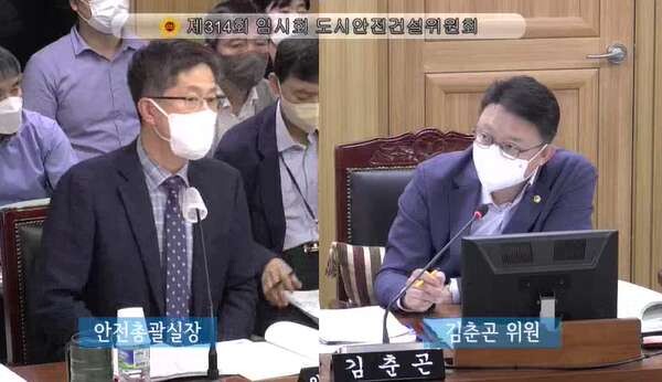 이날 회의에서 김춘곤 의원은 자연재해 사망을 보장항목에서 제외한 이유를 따져 물으며 안전총괄실의 안일한 업무처리를 강하게 질타했다.
