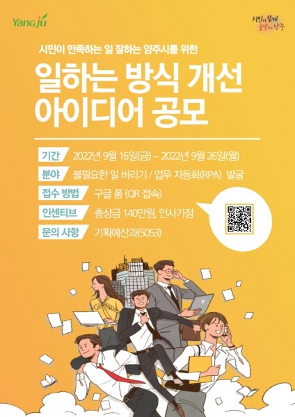 시 관계자는 “이번 공모전이 많은 직원의 아이디어 접수로 유능하고 효율적인 양주시를 조성할 수 있는 좋은 계기가 되길 기대한다”며 “직원 누구든지 실제 업무 과정에서 경험한 개선사례가 있다면 공모에 적극 참여해 주길 바란다”고 말했다.