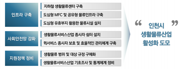 이 보고서는 인천시 생활물류산업 활성화 방안으로 생활물류서비스산업 기초조사 및 통계체계 정비, 이동노동자·플랫폼노동자 지원조례 제정을 통한 생활물류 종사자 지원 근거 마련 등을 제언하고 있다.