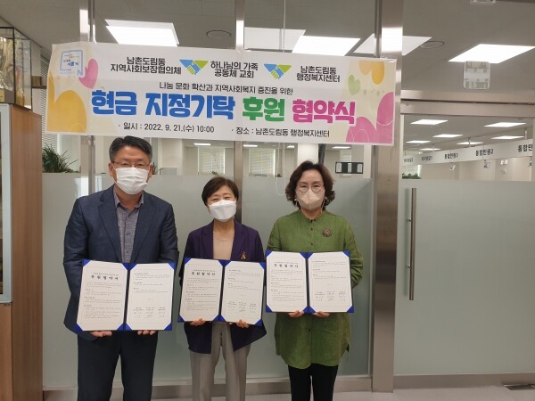 이번 협약은 하나님의 가족 공동체 교회의 제안으로 추진됐으며 매월 30만원을 사회복지공동모금회를 통해 남촌도림동 지역사회보장협의체에 현금 기탁할 계획이라고 전했다.