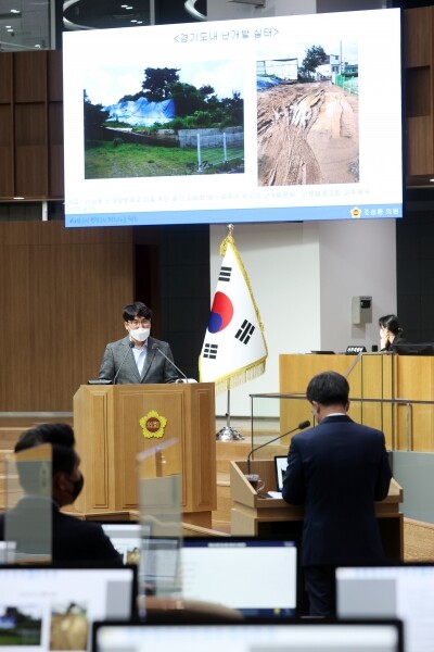 이 날 질문에서 조성환 의원은 아름다운 자연환경을 파괴하고 주민의 안전을 위협하는 도 내 난개발 문제를 언급하면서 “이러한 난개발의 원인 중 하나로 지목되고 있는 불법영업행위에 대한 사후조치로 경기도에서는 지난 2018년에 무등록 등 불법행위를 한 업체들을 적발해 고발하는 등 강력한 조치를 했다”고 말하며 “그럼에도 파주 소재 무등록 측량업체가 지난 2015년부터 2022년까지 무려 189건의 개발행위에 대한 민원업무를 대행해왔다”며 향후 이런 일이 재발되지 않도록 경기도 차원의 강력한 관리·감독을 요청했다.