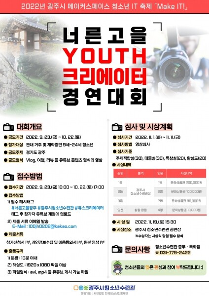 주제는 ‘경기도 광주’이며 Vlog, 여행, 리뷰 등 유튜브 콘텐츠 형식의 10분 이내 영상을 접수받는다.