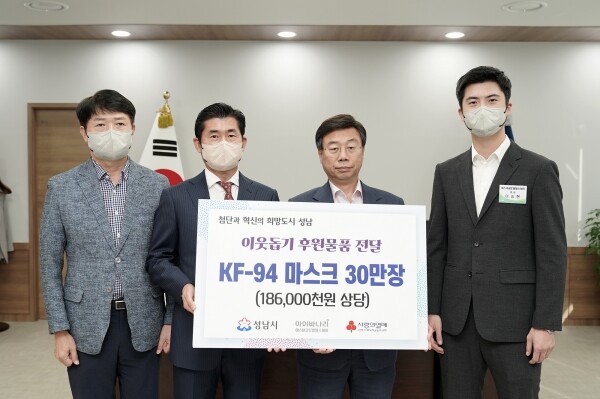 시는 이날 오후 4히 시장 집무실에서 신상진 성남시장과 이상봉 에스비 글로벌 헬스케어 회장, 이승현 대표 등이 참석한 가운데 ‘마스크 기탁식’을 했다.