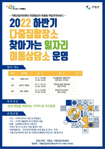 ‘2022 하반기 찾아가는 일자리 이동상담소’는 9월 26일 가평읍을 시작으로 9월 28일 청평면, 9월 30일 조종면 총 3회에 걸쳐 권역별로 운영되며 취업상담은 물론 이력서· 자기소개서 작성과 가평군일자리센터 집중 홍보 및 지원업무 등 취업관련 정보를 실시간으로 제공해 관내 구인·구직자들에게 안정적인 일자리 연계가 이루어 질 것으로 기대한다.