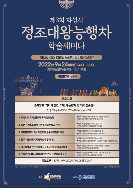 주제발표는 허용호 경주대학교 특임교수가 맡았으며 1부에서는 허명범 화성시문화재단 예술문화본부장, 박전열 중앙대학교 명예교수, 최종호 한국전통문화대학 교수, 남성진 진주문화연구소 소장이 국내외 근대시민축제와 정조대왕능행차를 비교 분석할 예정이다.