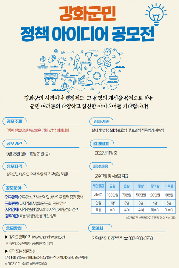 제안 접수는 강화군 홈페이지에 게시된 ‘정책 아이디어 공모’에서 신청서를 내려받아 작성 후 공모기간 내에 방문, 우편, 팩스 등을 통해 제출하면 된다.