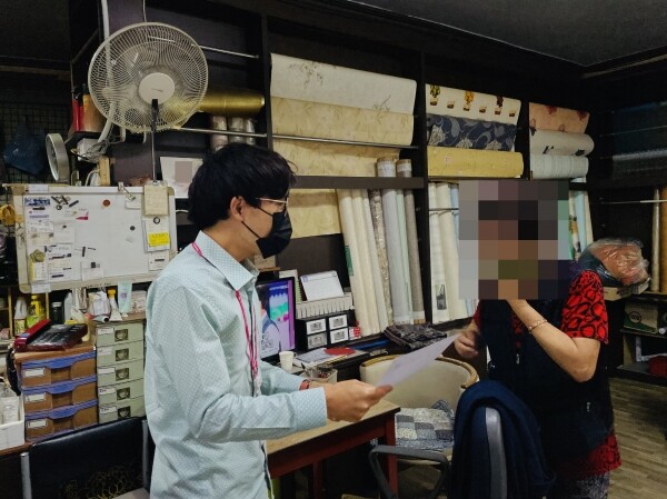 최근 중앙동 맞춤형복지팀 직원들은 노인복지관 인근에 소재한 벽지 판매장에 출장해 대표자와 소통하고 향후 적극적인 복지사각지대 발굴 및 제보를 요청했다.