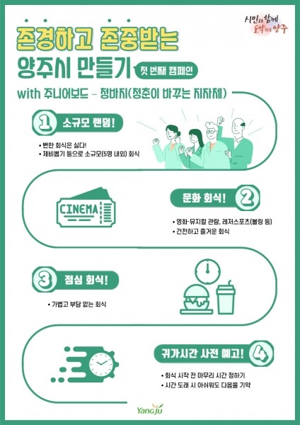 이번 캠페인은 직장 내 갑질을 예방하고 세대 간 문화와 가치관의 차이에서 비롯되는 갈등을 해소해 서로가 존중하고 존중받는 양주시 조직문화를 조성하고자 MZ세대 직원으로 구성된 양주시 주니어보드에서 제안했다.