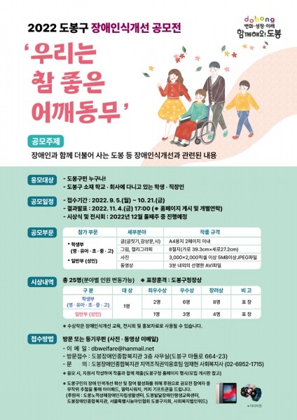‘우리는 참 좋은 어깨동무’는 장애인과 비장애인이 함께 더불어 사는 도봉을 주제로 한 장애인 인식개선 창작물을 공모한다.