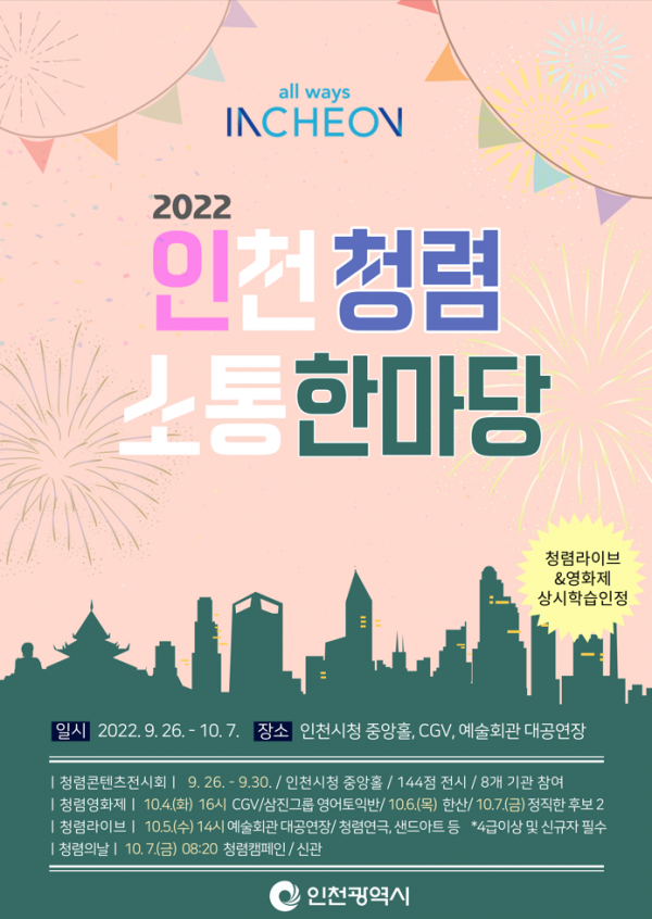 인천광역시는 9월 26일부터 10월 7일까지 2주간 ‘일상 속 청렴’을 주제로 다양한 문화 콘텐츠와 결합한 청렴소통 문화의 장을 개최한다고 밝혔다.