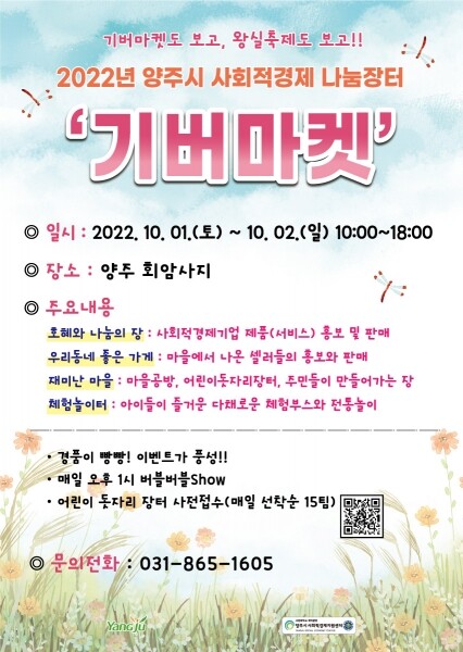 회암사지 왕실축제와 함께 운영될 이번 나눔장터는 ‘호혜와 나눔의 장’을 통해 사회적경제기업의 제품 홍보 및 판매를 촉진하고 ‘재미난 마을장’을 통해 마을에서 나온 공동체와 단체, 소상공인들을 소개할 예정이다.