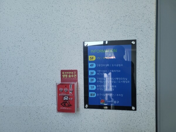 생명 숨수건은 특수용액이 함유된 7중 필터 형태의 습식 손수건으로 화재시 코와 입을 막고 대피할 경우 유독가스로부터 호흡기를 보호해 주는 역할을 해 민원인과 직원들의 소중한 생명을 보호한다.