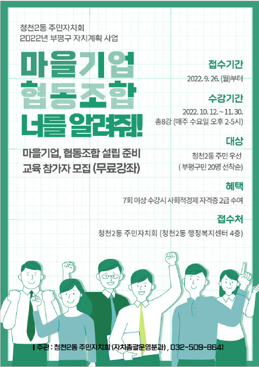 모집은 20명이며 청천2동 거주민을 우선 선발하되, 인원 미달 시 부평구민도 참가 가능하다.