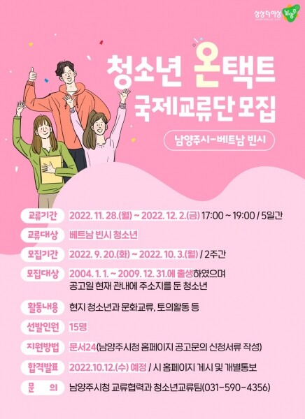 2004.1.1.∼2009.12.31.에 출생하고 공고일 현재 관내에 주소지를 두고 기초 영어 회화가 가능한 자 등 참가 자격을 충족하는 관내 모든 청소년은 본 교류사업에 참가 신청이 가능하며 이번 온택트 교류 참가자들은 내년 초 실시 예정인 베트남 빈시 방문교류에도 참여할 예정이다.