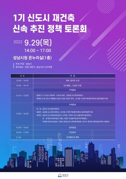 시 관계자는 “성남시는 오는 10월 시장 직속의 재개발·재건축 추진단을 구성·운영해 안정적인 주택공급과 투명한 도시 정비사업을 위한 지원책을 강구할 방침”이며 “이번 토론회 또한 그 맥락에서 마련한 것”이라고 말했다.