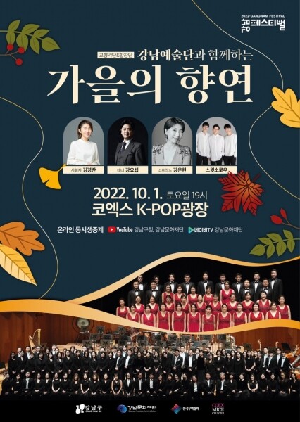 같은 날 오후 7시부터 8시 30분까지 코엑스 K-POP 광장에서 ‘2022 강남예술단과 함께하는 가을의 향연’이 개최된다.