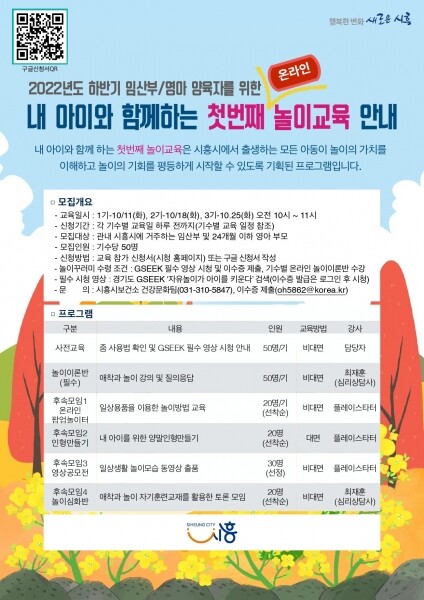 자세한 신청 방법, 교육 내용, 후속모임 일정은 시흥시청 누리집 또는 안내 포스터의 QR코드를 통해 확인할 수 있다.