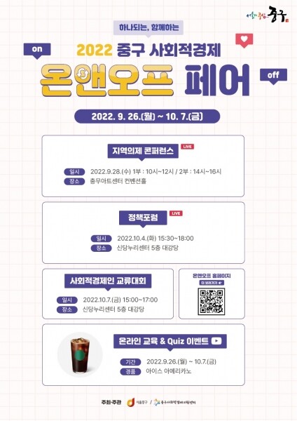 구가 주최하고 중구 사회적경제지원센터가 주관하는 이번 행사는 9.26.부터 10.7.까지 2주간 대면 행사와 온라인으로 진행된다.