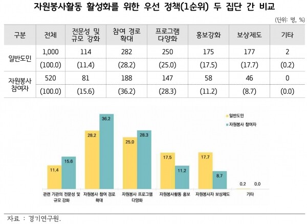 2022년 7월 6일~7일 경기도민 1,000명과 2022년 7월 4일~11일 경기도 자원봉사활동에 참여해 본 경험이 있는 참여자 520명 대상으로 자원봉사활동에 대한 인식조사 결과, 도민 28.2%, 자원봉사참여자 36.2%가 자원봉사 참여 경로 확대를 꼽았으며 도민 25%, 자원봉사참여자 28.3%가 자원봉사 프로그램 다양성 강화가 필요하다고 응답했다.