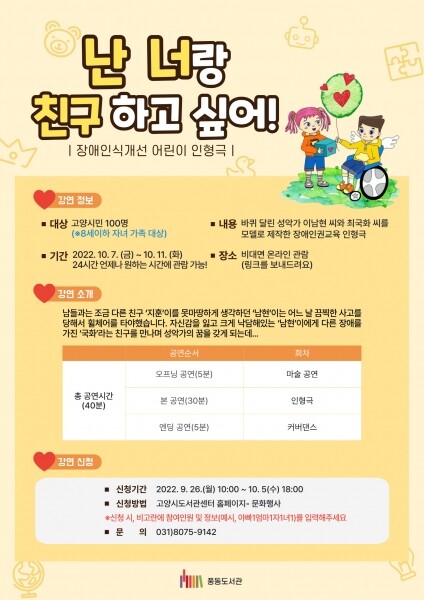 오프닝 공연: 마술 공연, 본 공연: 인형극, 엔딩 공연: 커버댄스의 순서로 진행되며 프로그램 신청은 9월 26일 오전 10시부터 고양시도서관센터 홈페이지를 통해서 선착순 100명까지 가능하다.