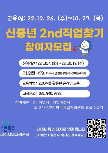 신청 자격은 파주시 거주자로 방문, 네이버폼, 이메일 팩스를 통해 신청할 수 있으며 지원자가 많을 경우 근무경력, 취업의지 등 자체 심사를 통해 교육생을 선발할 예정이다.