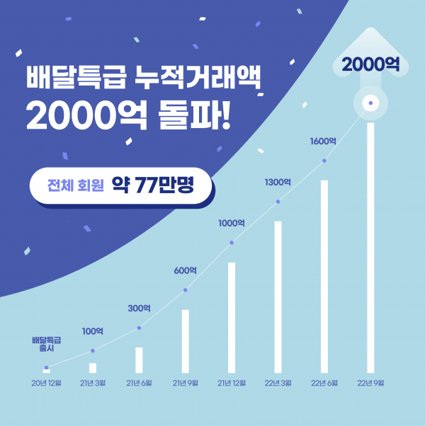 경기도주식회사는 지난 9월 25일 일요일 기준, 배달특급의 총 누적 거래액이 2,000억원을 넘었다고 27일 밝혔다.