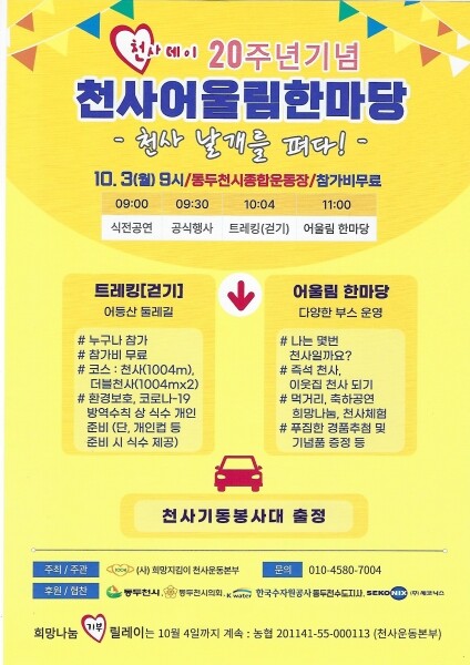 행사를 주관하는 희망지킴이 천사운동본부는 ‘천사’의 마음을 가진 시민들에게 월 1만원씩 후원받아 우리 주변의 소외이웃에게 꾸준히 사랑 나눔을 실천하고 있는 동두천시 대표 희망재단이다.