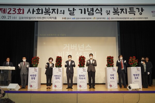 이와 함께 이날 기념행사에서는 사회복지 종사자 대표의 ‘사회복지 윤리선언문’ 낭독이 있었으며 ‘사회복지거버넌스 비젼 선포식’을 통해 따뜻한 동행, 거버넌스, 통하는 70도시, 가치누림, 행복한 김포를 염원하는 매직트리 퍼포먼스도 펼쳐졌다.