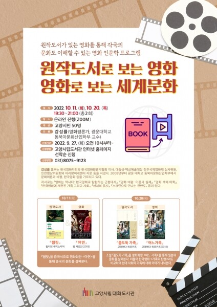 이번 프로그램은 광운대학교 동북아문화산업학부 교수이자 영화평론가인 강성률 교수가 진행하며 10월 대화도서관 종합자료실 북큐레이션 주제와도 연계해 폭넓은 도서 선택과 독서에 도움이 될 것으로 보인다.