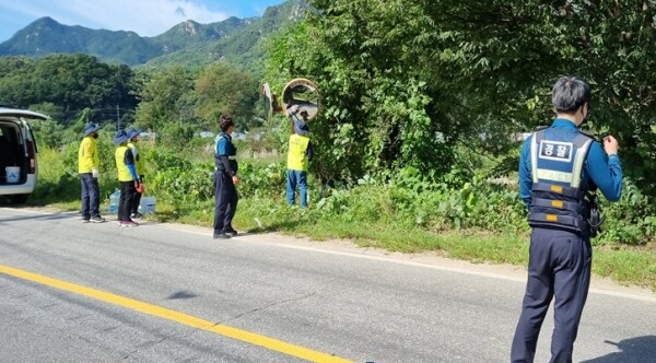 반사경 세척 작업은 행복마을관리소와 조종파출소가 연계해 진행하는 사업으로 면내 유지관리가 안 되고 있는 반사경을 세척하고 반사경 주위 시야를 가리는 넝쿨이나 나뭇가지 제거하는 등의 작업을 했다.