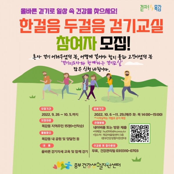 아울러 중부건강생활지원센터에서는 매월 ‘걷자 목감 7,000보’ 걷기챌린지 및 자율 걷기동아리 운영, 걷기지도자 양성, 걷기코스 개발 등 지역 주민들의 일상 속 걷기 활성화를 위해 노력하고 있으며 주민들도 활발히 참여하고 있다.