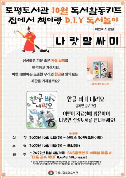 10월에는 한글날을 맞이해 한글과 관련된 흥미로운 추천 도서 목록과 활동 키트를 배부할 예정이다.