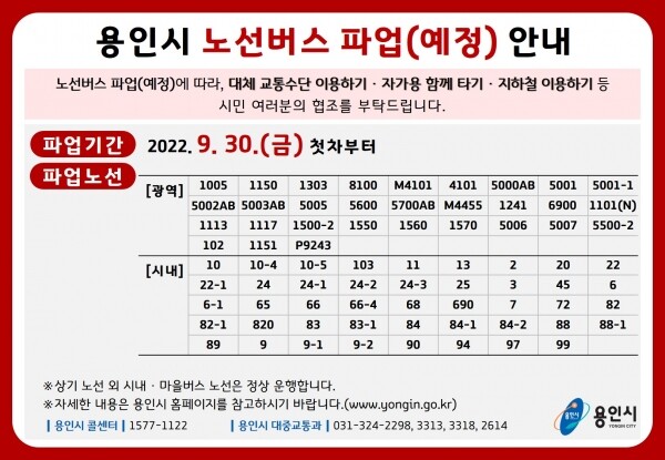 먼저 30일 첫차부터 파업이 예고된 노선 중 대체 교통수단 확보가 어려운 15개 노선에 60대의 전세버스를 투입해 시민들이 철도망 등을 이용할 수 있도록 주요 전철역과 용인터미널까지 운행한다.