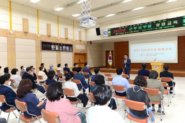 이번 교육은 민선8기를 맞아 ‘꿈을 이루는 행복한 연수’를 만들기 위해 중축적인 역할을 맡고 있는 간부공무원들의 청렴의지를 다지고 깨끗하고 신뢰받는 공무원상을 확립하기 위해 마련됐다.