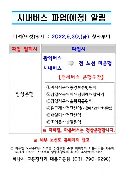 하남시는 염준호 부시장을 본부장으로 하는 비상수송대책본부를 설치해 세부 수송대책 수립 및 기관 협의 등에 나선다.