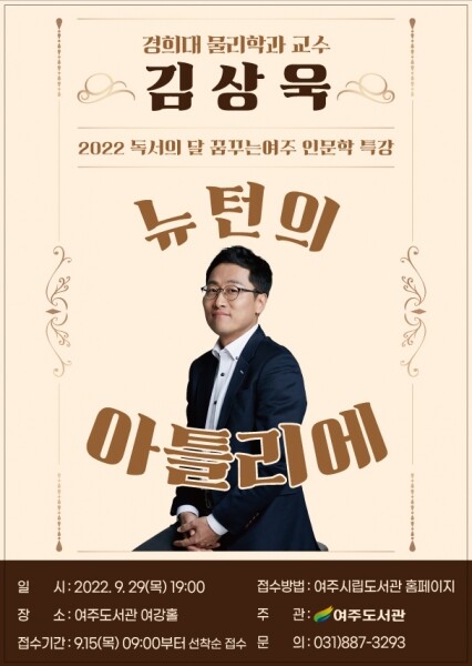 9월 독서의 달을 맞이해 시민들의 인문학적 소양을 확장시키고자 ‘뉴턴의 아틀리에’의 저자 김상욱 교수를 초청해 ‘뉴턴의 아틀리에-물리학자의 눈으로 본 예술’이라는 주제로 강연할 예정이다.