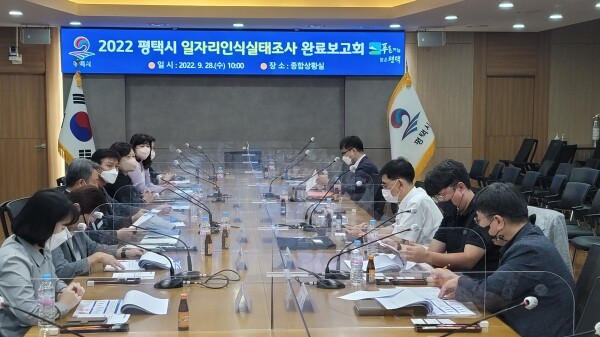 이날 보고회에는 평택고용센터·한국고용정보원·국민대·호서대·평택시 실무부서 담당자 20여명이 참석한 가운데 일자리인식실태조사 분석 결과보고 및 행정에 활용 방안 등을 논의하는 자리가 됐다.