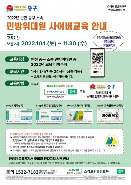 중구 관계자는 “민방위대원들의 편의와 안전한 교육을 위해 비대면으로 사이버 민방위 교육을 진행하니, 많은 대원들의 참여를 당부드린다”며 “이번이 마지막 보충교육으로 교육 불참 시에는 민방위 기본법에 따라 불이익을 받을 수 있는 점 유의해 주시기를 바란다”고 말했다.
